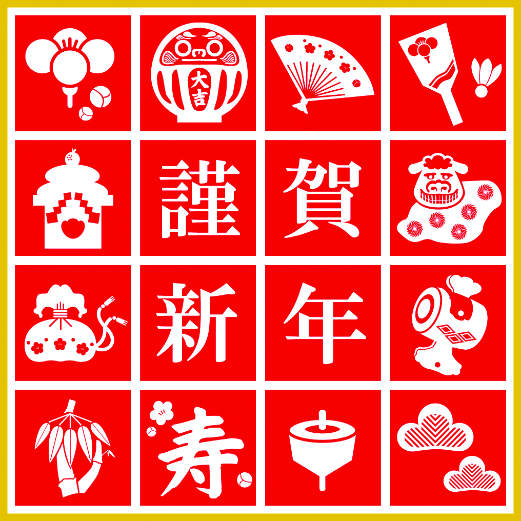 - 正月アイテムを集めたイラスト01(赤・和テイスト)JPG