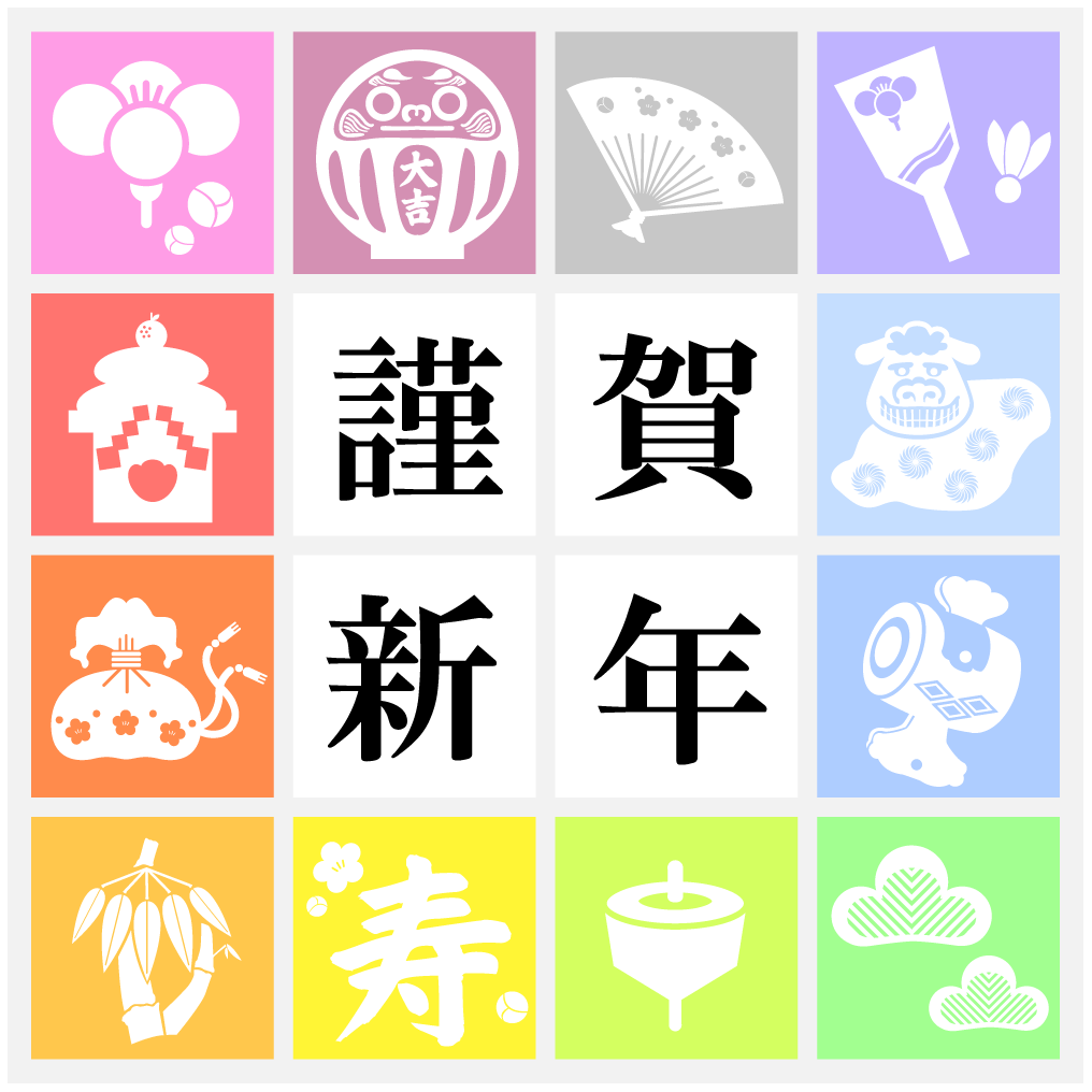 - 正月アイテムを集めたイラスト02(レインボー・和テイスト)GIF
