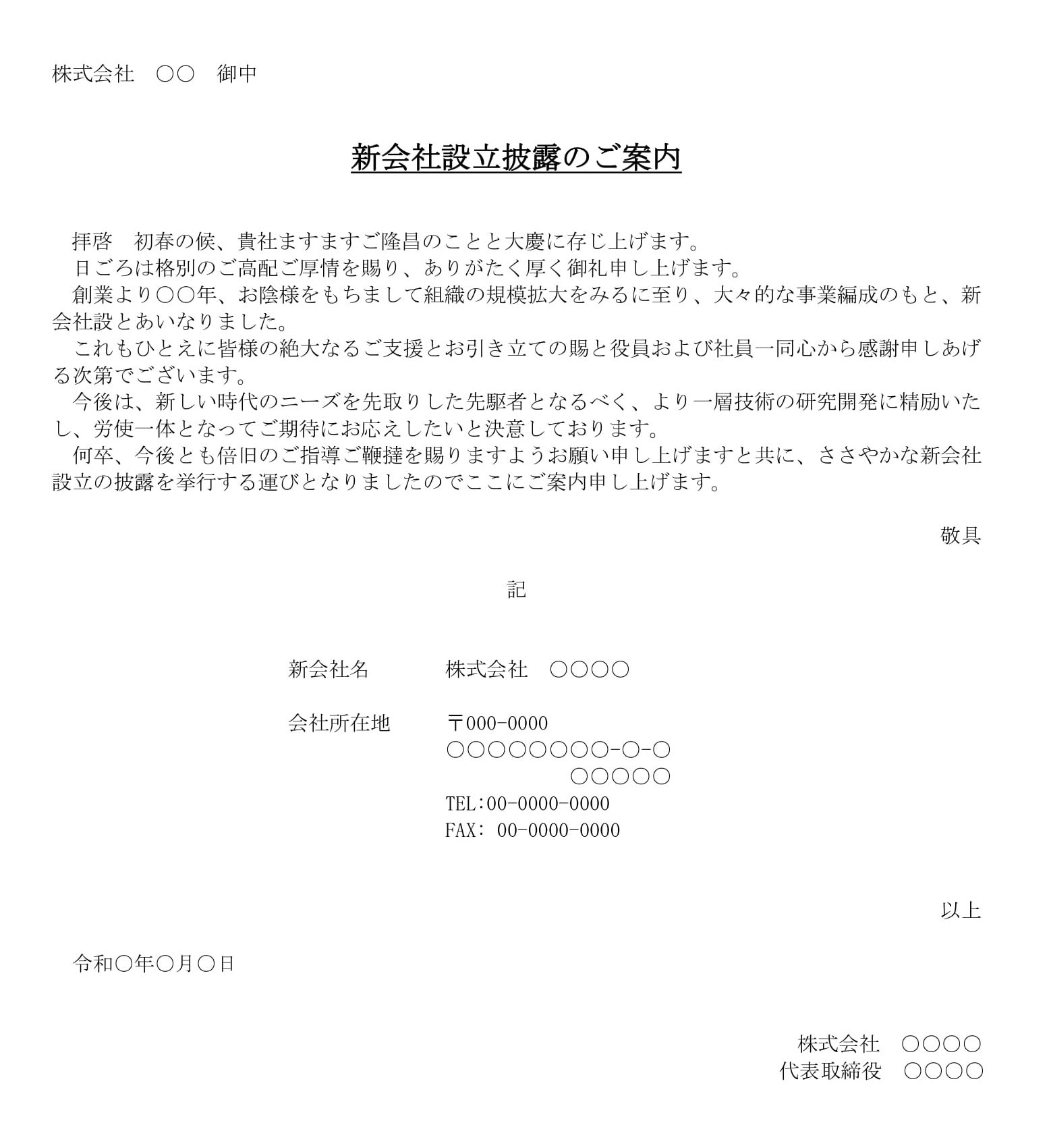 - 新会社の名称、所在地、連絡先などを記載して、正確な情報を提供します。例:「新会社名 株式会社 ○○○○」「会社所在地 〒000-0000 ○○○○○○○○-○-○」。