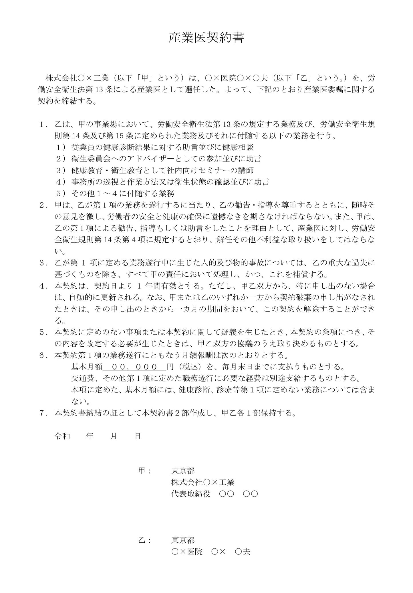 - 甲: 株式会社○×工業(産業医を依頼する側)
