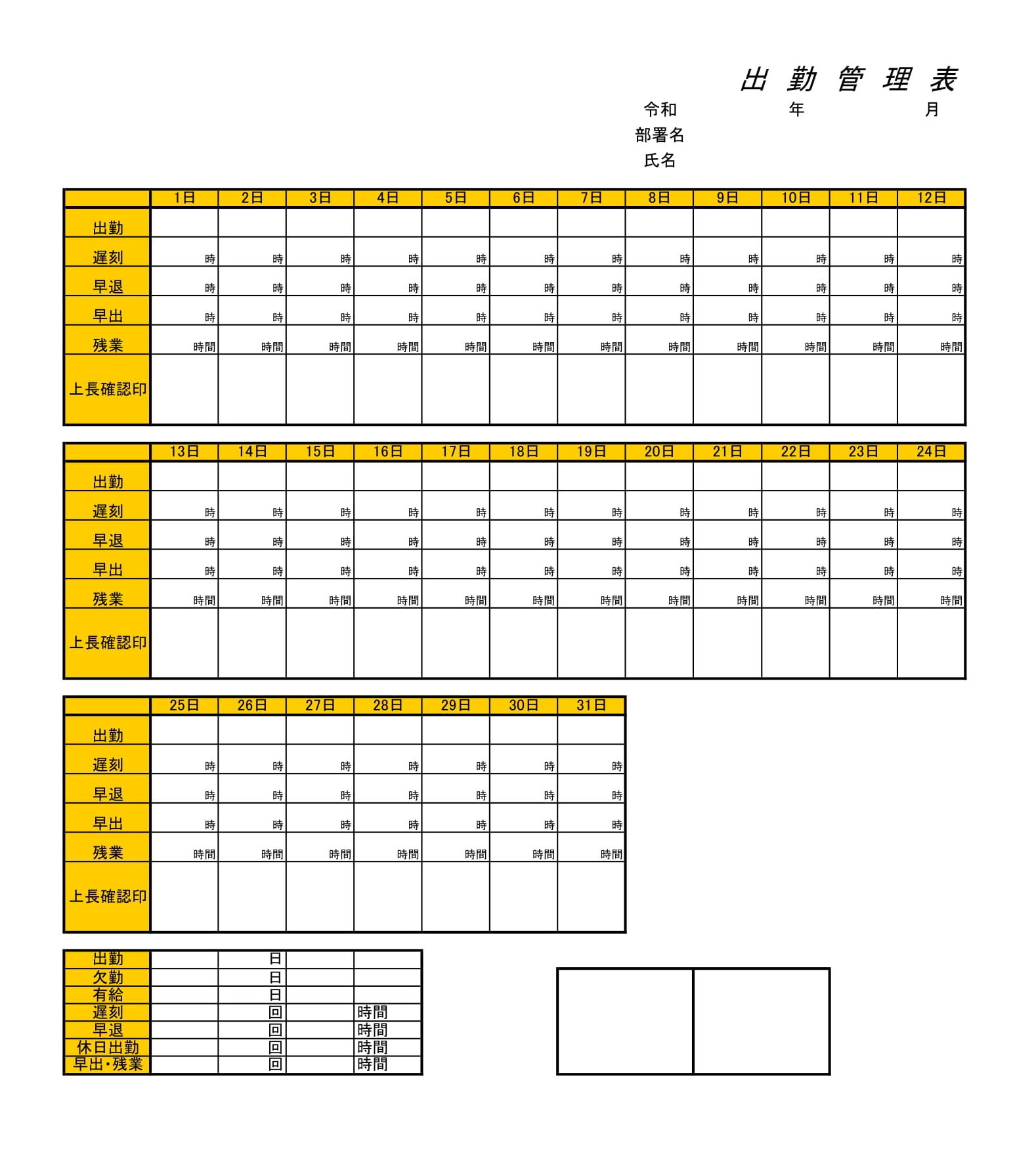 人事 出勤管理表06のダウンロード 出勤管理表06のExcel(エクセル)の書式テンプレートを会員登録不要で、無料でダウンロードできます。テンプレート書式なので必要に応じて文章を変更してご利用ください。作成のポイント1. 基本情報の記載 タイトル: 「出勤管理表」を明記し、内... 人事雇用関係
