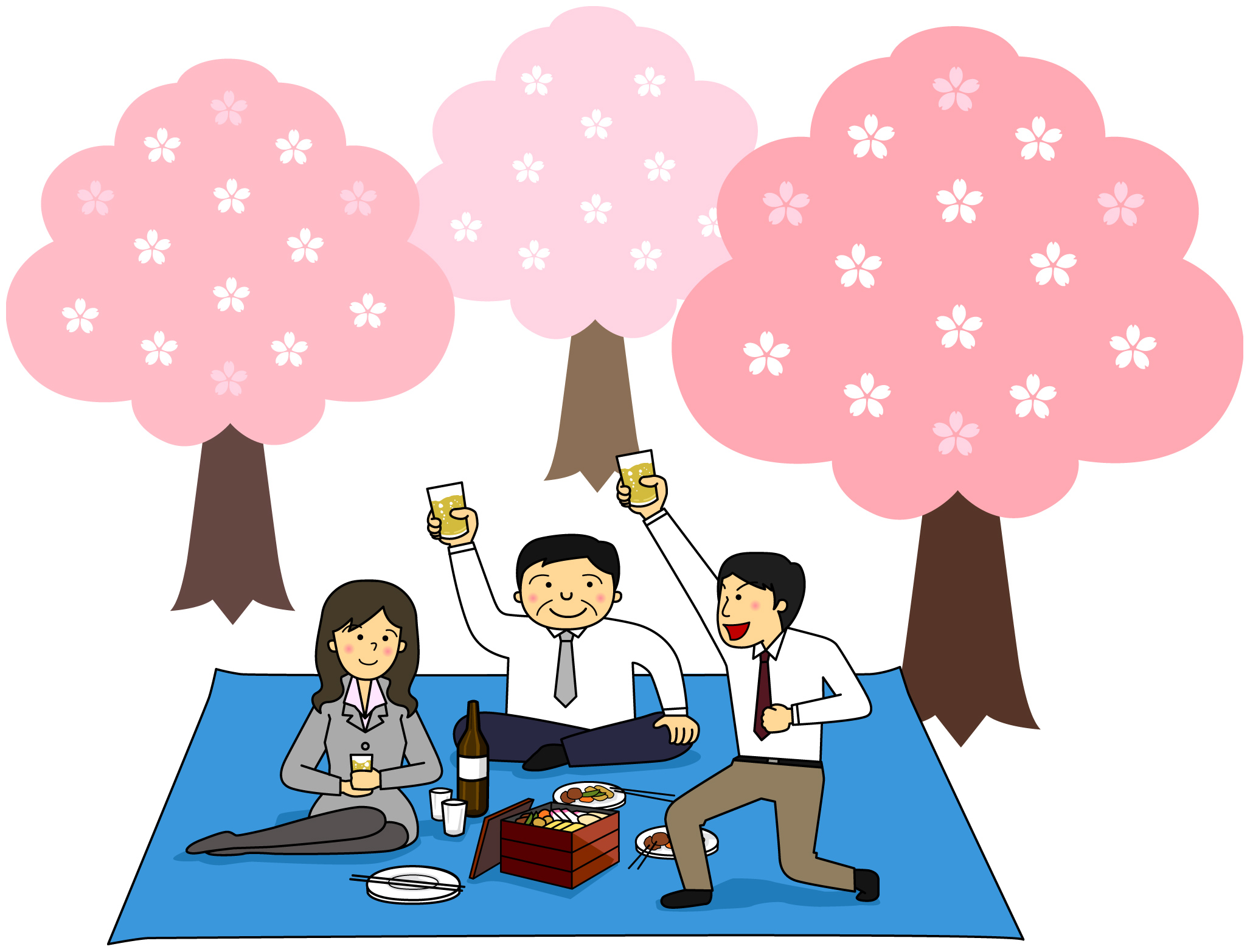お花見のイラスト04(ブルーのスーツの男性、ベージュのスーツの男性、ライトグレーのスーツの女性)【JPG】のダウンロード