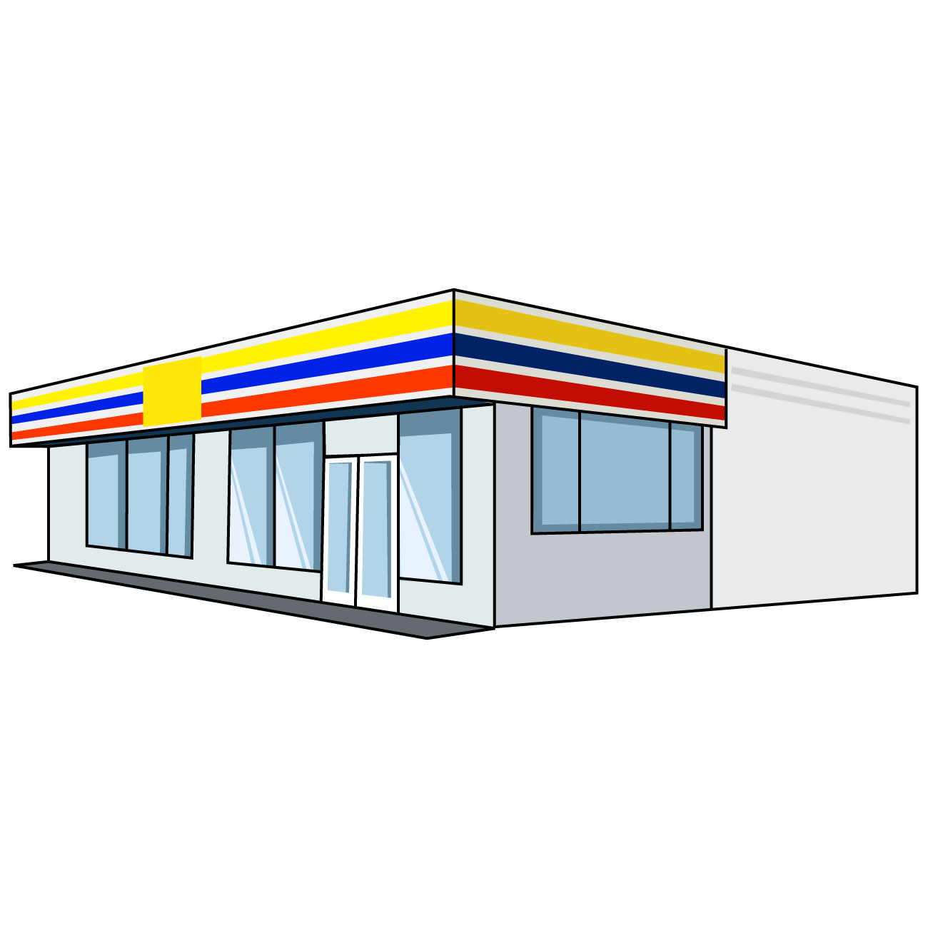 コンビニのイラスト02(イエロー、ブルー、レッドのラインにホワイトの塀・左向き)【JPG】のダウンロード