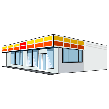 コンビニのイラスト04(イエロー、オレンジのラインにホワイトの塀・左向き)【PNG】のダウンロード