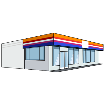コンビニのイラスト08(オレンジ、レッド、ブルーのラインにホワイトの塀・右向き)のPNG(ピング)を会員登録不要で、無料でダウンロードできます。