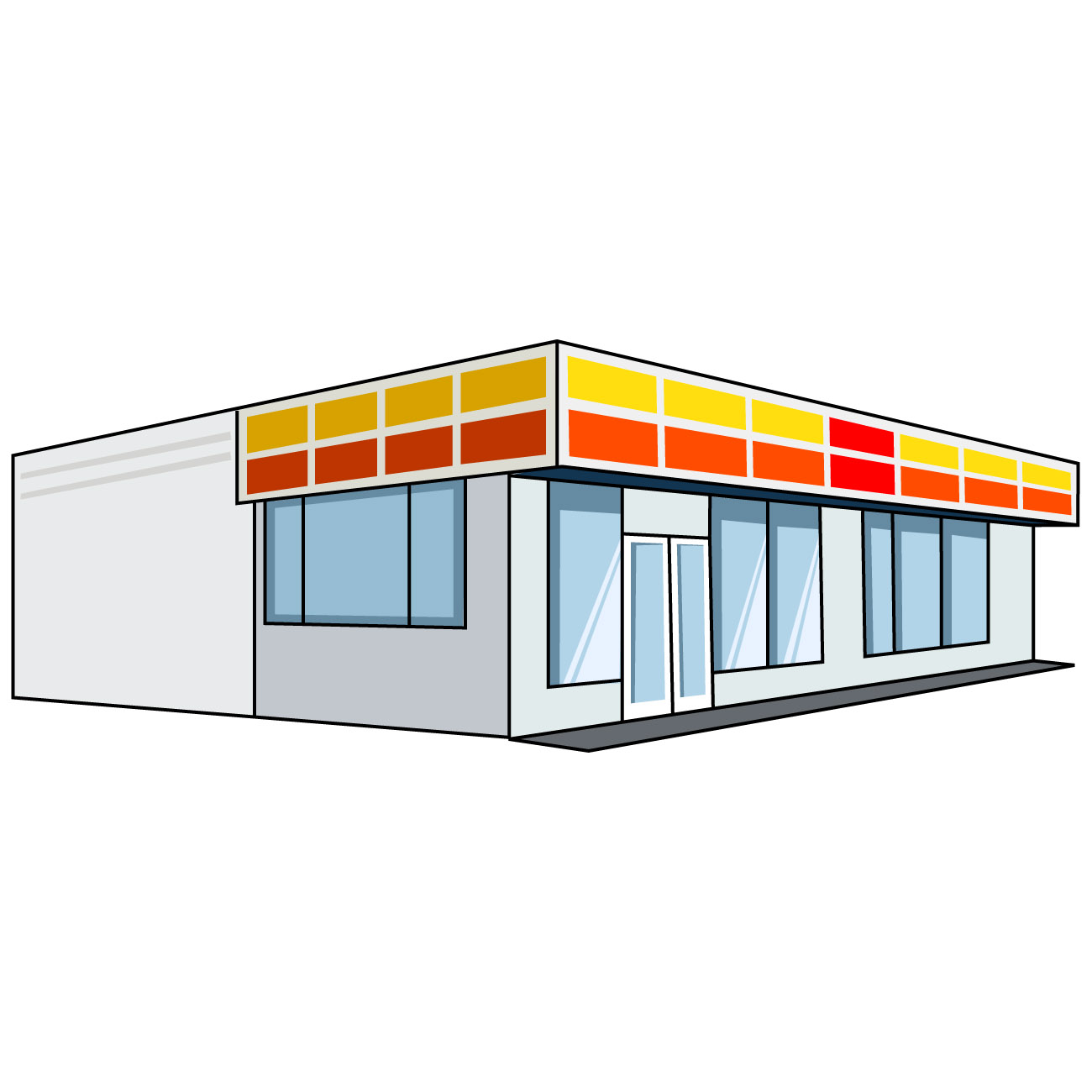 コンビニのイラスト09(イエロー、オレンジのラインにホワイトの塀・右向き)のJPG(ジェイペグ)を会員登録不要で、無料でダウンロードできます。