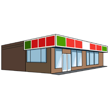コンビニのイラスト21(レッド、グリーンのラインにブラウンの塀・右向き)【PNG】のダウンロード