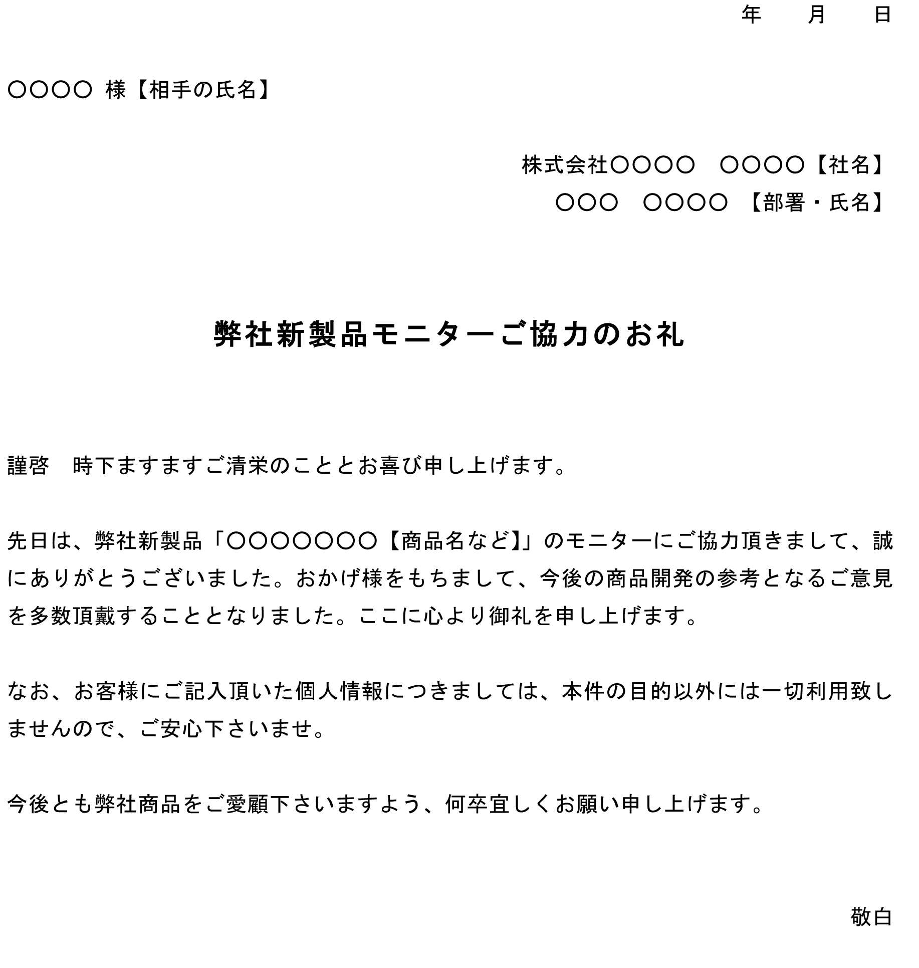 - 新製品モニターへの協力に感謝の言葉を添える。