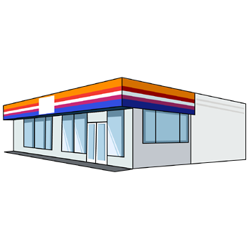 コンビニのイラスト03(オレンジ、レッド、ブルーのラインにホワイトの塀・左向き)【PNG】のダウンロード