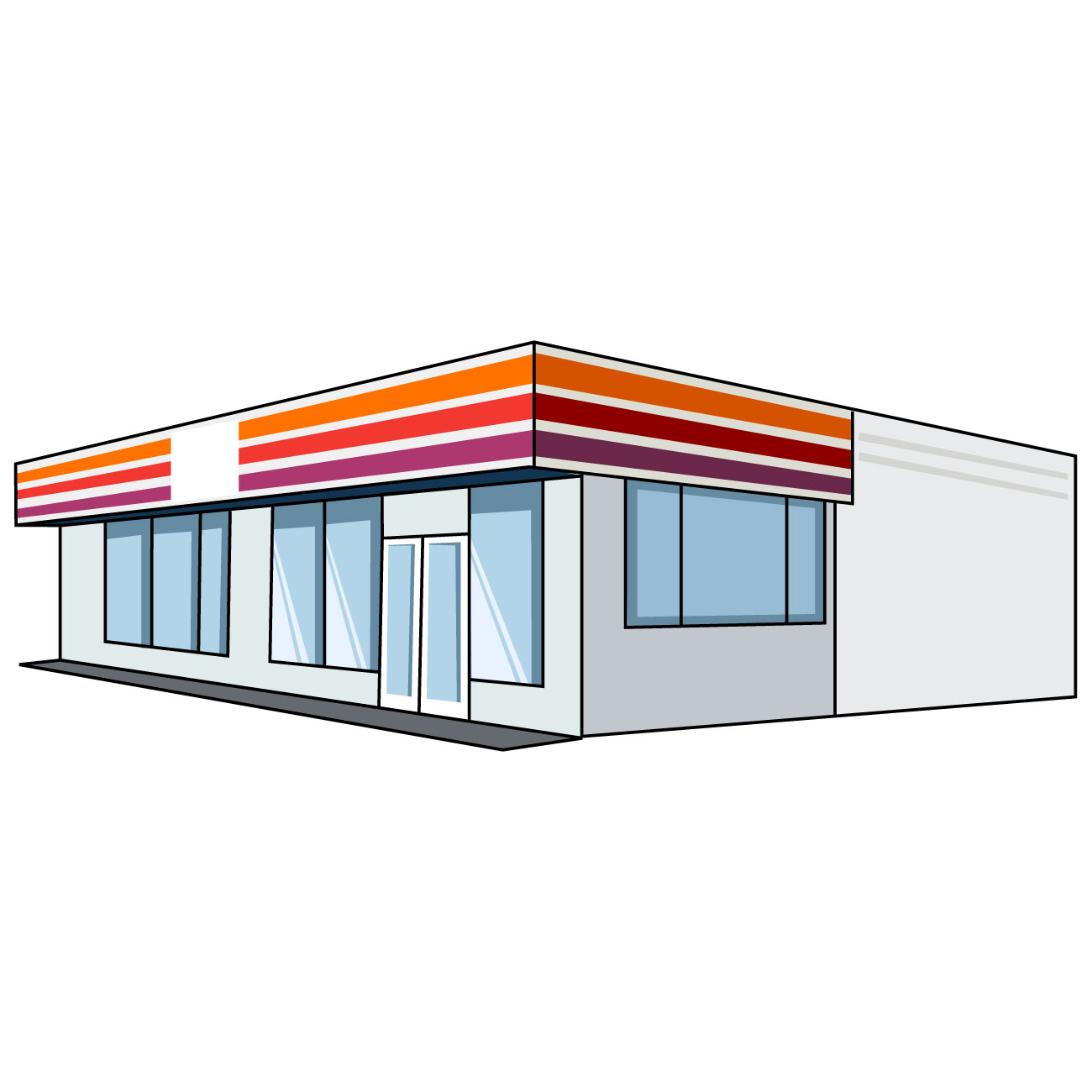 コンビニのイラスト06(オレンジ、レッド、パープルのラインにホワイトの塀・左向き)のJPG(ジェイペグ)を会員登録不要で、無料でダウンロードできます。