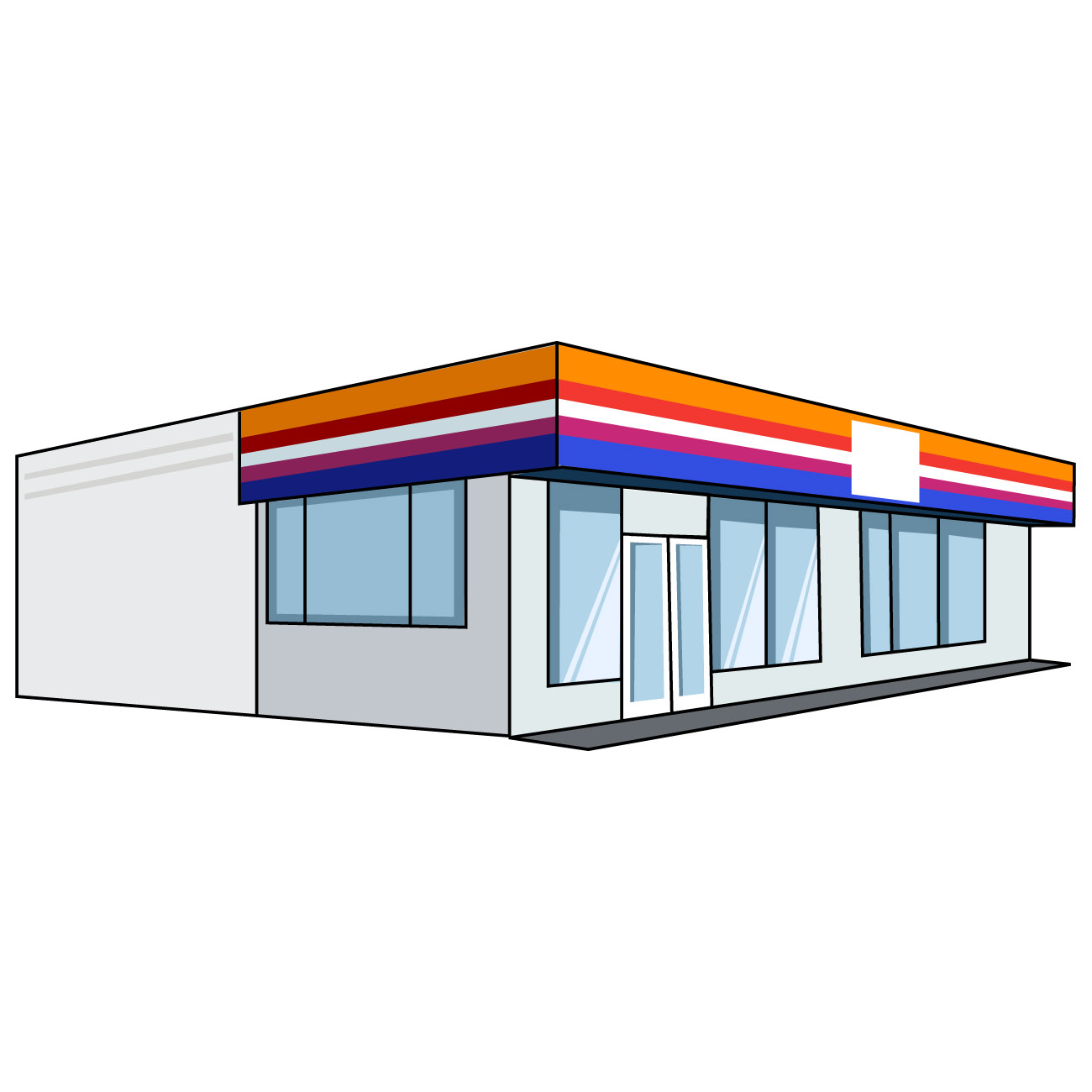 コンビニのイラスト08(オレンジ、レッド、ブルーのラインにホワイトの塀・右向き)のJPG(ジェイペグ)を会員登録不要で、無料でダウンロードできます。