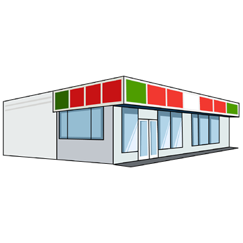 コンビニのイラスト10(レッド、グリーンのラインにホワイトの塀・右向き)【PNG】のダウンロード