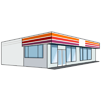 コンビニのイラスト11(オレンジ、レッド、パープルのラインにホワイトの塀・右向き)のPNG(ピング)を会員登録不要で、無料でダウンロードできます。