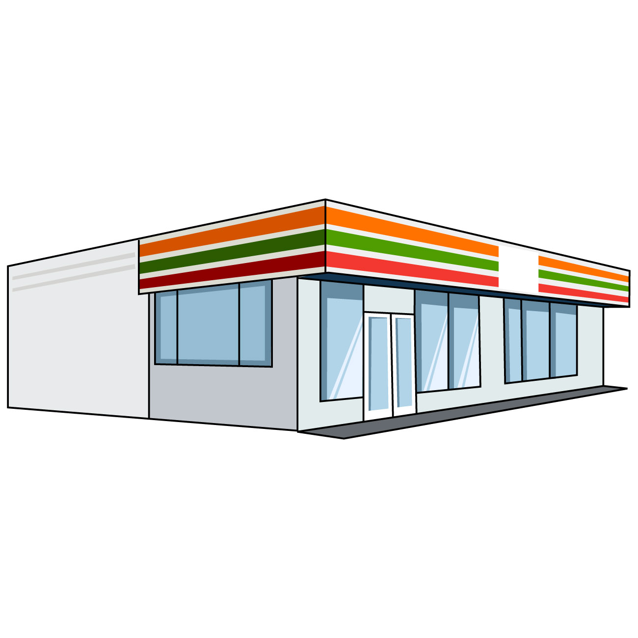 コンビニのイラスト12(オレンジ、グリーン、レッドにホワイトの塀・右向き)のJPG(ジェイペグ)を会員登録不要で、無料でダウンロードできます。