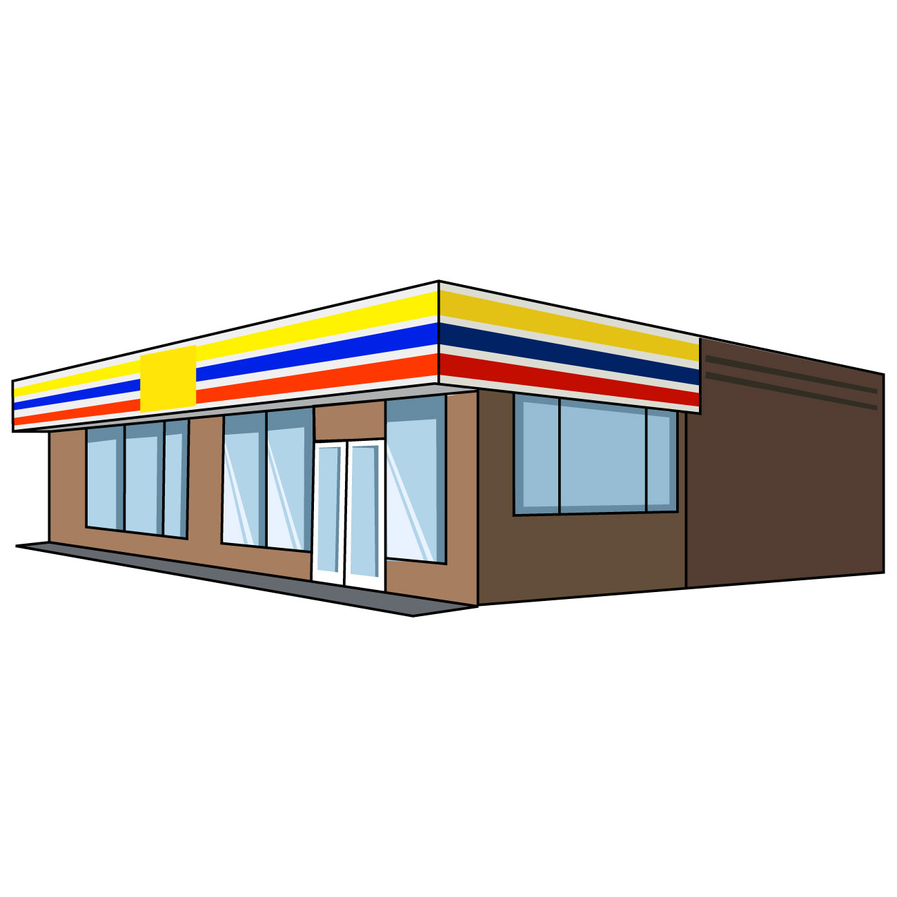 コンビニのイラスト13(イエロー、ブルー、レッドのラインにブラウンの塀・左向き)【JPG】のダウンロード