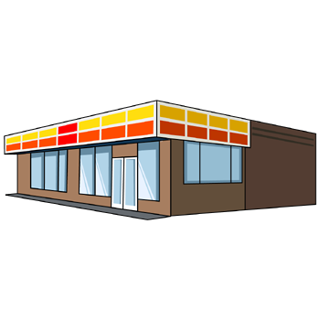 コンビニのイラスト15(イエロー、オレンジのラインにブラウンの塀・左向き)【PNG】のダウンロード