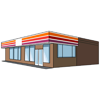 コンビニのイラスト17(オレンジ、レッド、パープルのラインにブラウンの塀・左向き)のPNG(ピング)を会員登録不要で、無料でダウンロードできます。