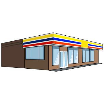 コンビニのイラスト19(イエロー、ブルー、レッドのラインにブラウンの塀・右向き)【PNG】のダウンロード
