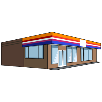 コンビニのイラスト20(オレンジ、レッド、ブルーのラインにブラウンの塀・右向き)のPNG(ピング)を会員登録不要で、無料でダウンロードできます。