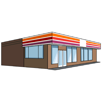 コンビニのイラスト22(オレンジ、レッド、パープルのラインにブラウンの塀・右向き)のPNG(ピング)を会員登録不要で、無料でダウンロードできます。