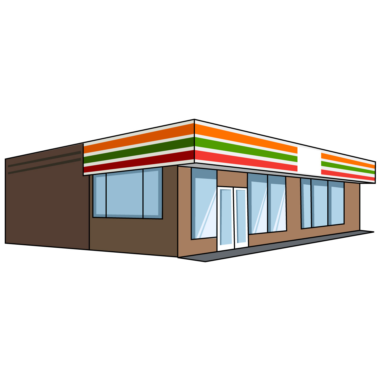 コンビニのイラスト23(オレンジ、グリーン、レッドのラインにブラウンの塀・右向き)のJPG(ジェイペグ)を会員登録不要で、無料でダウンロードできます。