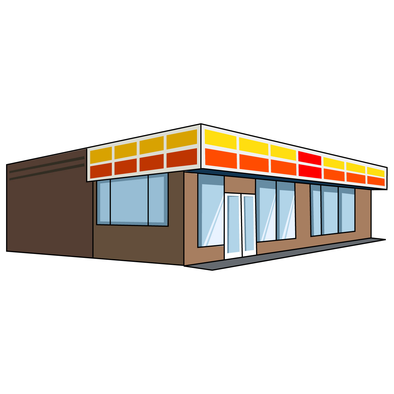 コンビニのイラスト24(イエロー、オレンジのラインにブラウンの塀・右向き)【JPG】のダウンロード