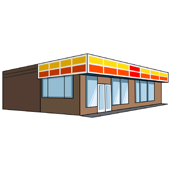 コンビニのイラスト24(イエロー、オレンジのラインにブラウンの塀・右向き)のPNG(ギフ)を会員登録不要で、無料でダウンロードできます。