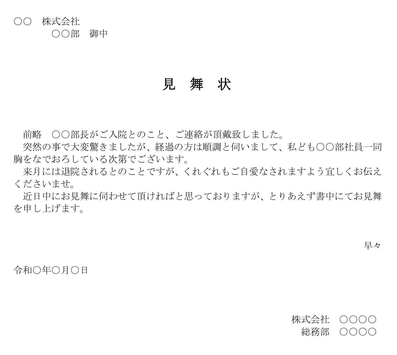 庶務 見舞状の書式・文例テンプレート(Word・ワード) 見舞状の書式テンプレートです。会員登録不要・無料ですぐにテンプレートをダウンロードしてご利用できます。書き方のポイント冒頭の挨拶「前略」や「拝啓」など、状況に応じた冒頭の挨拶を使用します。状況が緊急であれば「前略」を使用し、通常の見舞状では... 庶務見舞状