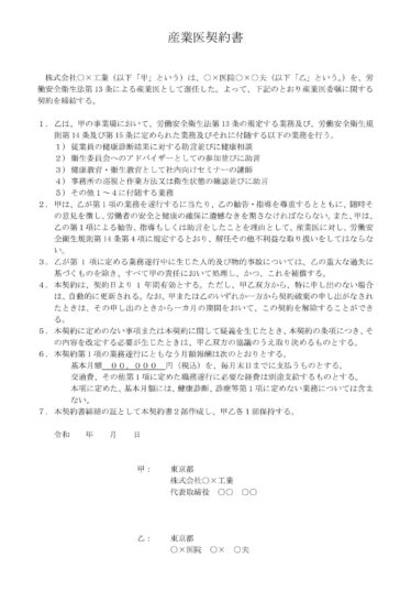 その他契約書 産業医契約書の書式テンプレート(Word・ワード) 産業医契約書の書式テンプレートです。会員登録不要・無料ですぐにテンプレートをダウンロードしてご利用できます。書き方のポイント1. 契約当事者 甲: 株式会社○×工業(産業医を依頼する側) 乙: ○×医院 ○× ○夫(産業医として業務を行う側... その他契約書契約書